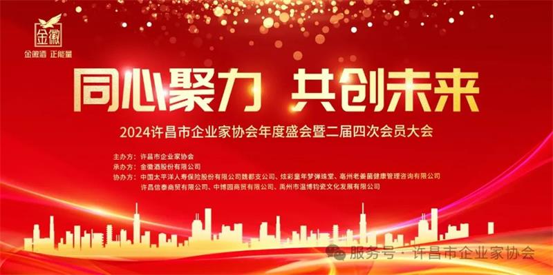 許昌市企業(yè)家協(xié)會2024年年度盛會由金徽酒豫南運營中心總冠名,由中國太平洋人壽保險股份有限公司魏都支公司、炫彩童年夢彈珠堂、亳州老姜菌健康管理咨詢有限公司、許昌信泰商貿(mào)有限公司、中博園商貿(mào)有限公司、禹州市溫博鈞瓷文化發(fā)展有限公司等單位協(xié)辦。